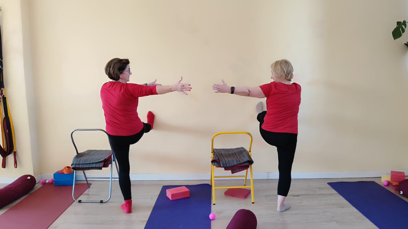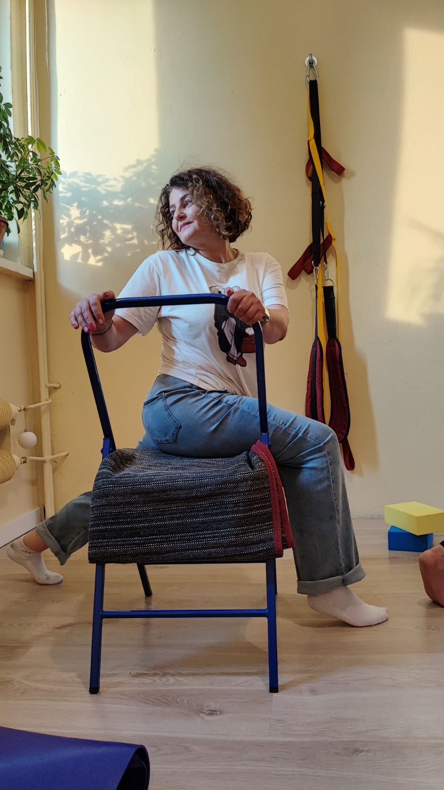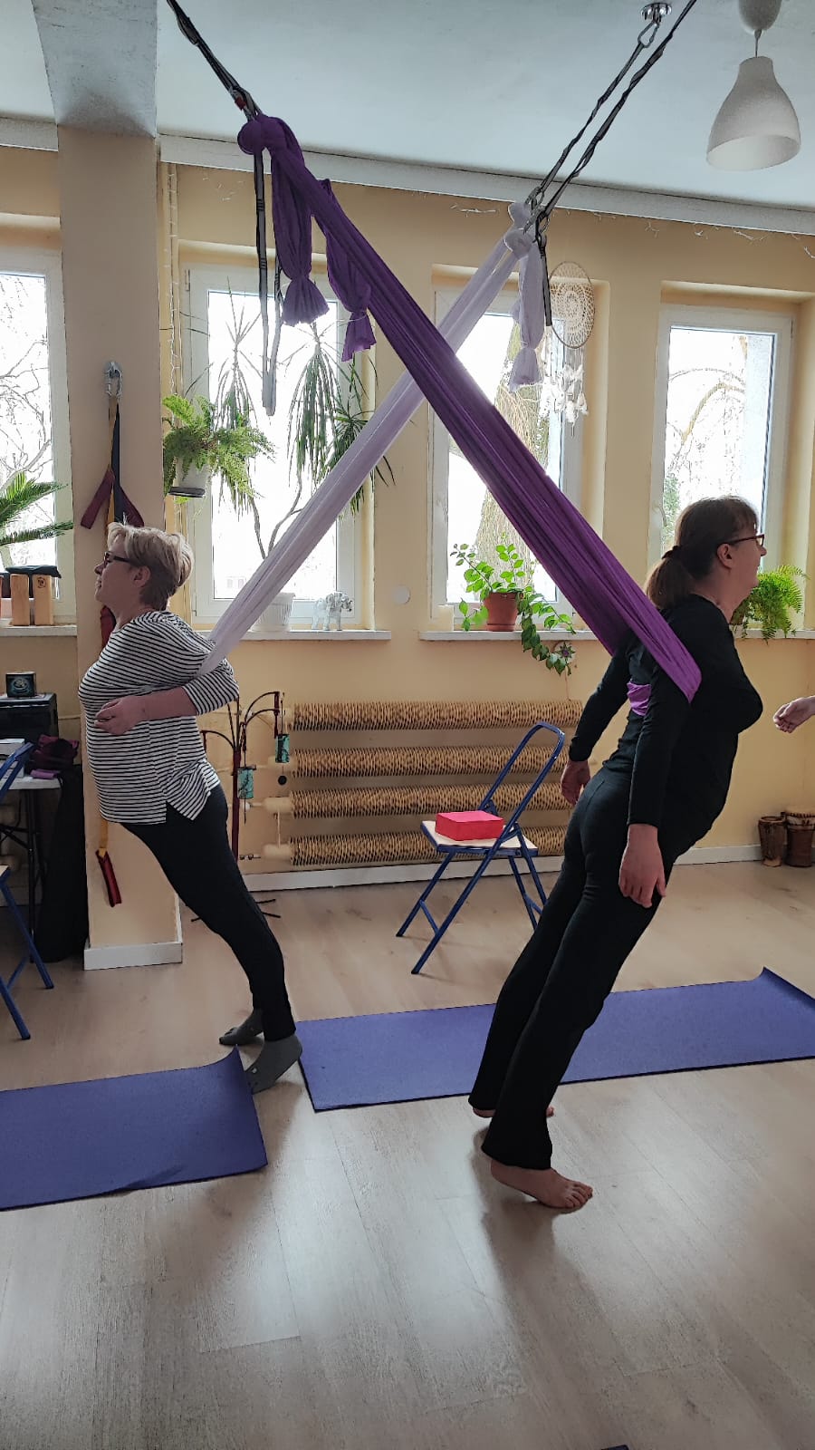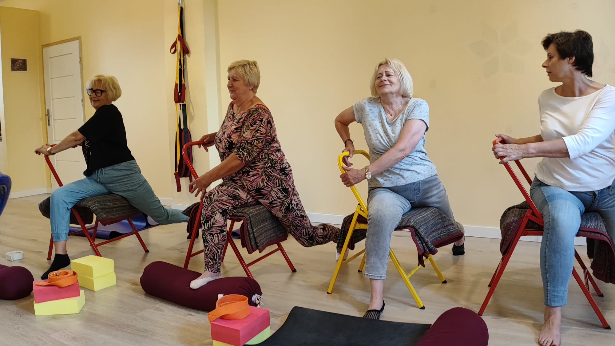 Łagodne zajęcia w bezpiecznym tempie: pracujemy na krzesłach, przy ścianie i w chustach (hamakach). Więcej swobody w barkach i biodrach, mniej bólu i napięcia — kameralnie, z uważną opieką instruktora.