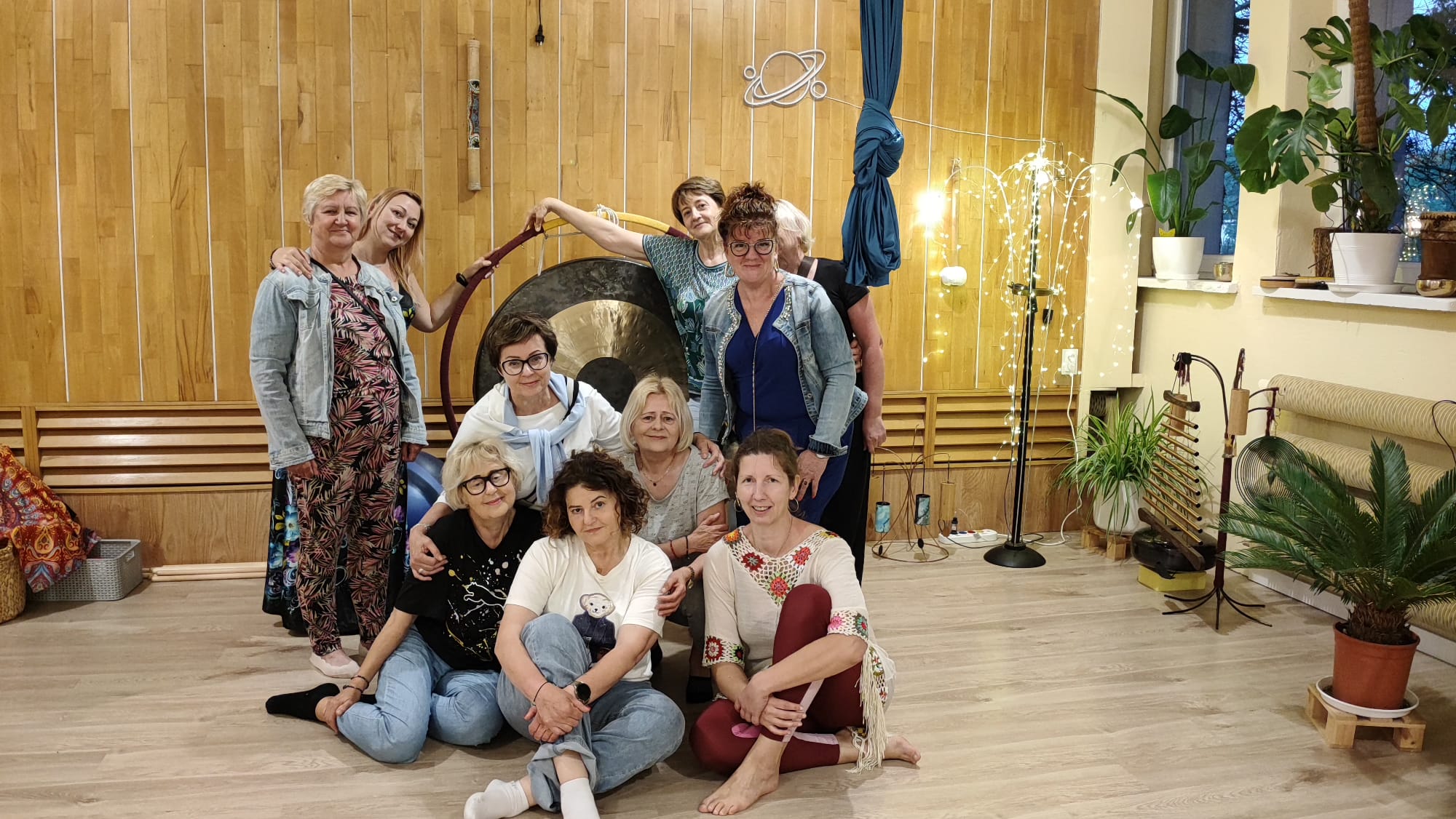 Wygodny strój. Maty, krzesła i chusty mamy na miejscu. Woda i cienki sweter na relaks – mile widziane.